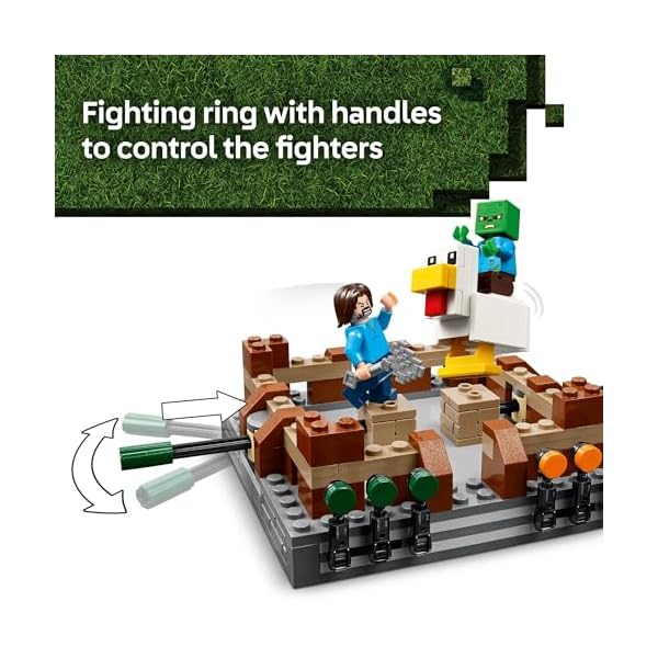 FUN TOY FOR KIDS – The LEGO Minecraft Woodland Mansion Fighting Ring includes a functional fighting ring with score-keepers in front of a mansion facade with a removable chest